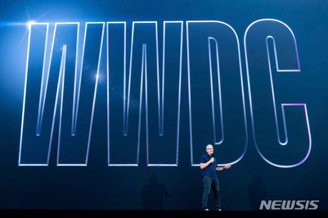 [쿠퍼티노=AP/뉴시스]팀 쿡 애플 최고경영자(CEO)가 지난 6일(현지시간) 미국 캘리포니아 쿠퍼티노 애플 본사에서 열린 세계개발자컨퍼런스(WWDC22)에서 연설하고 있다. 2022.06.06.