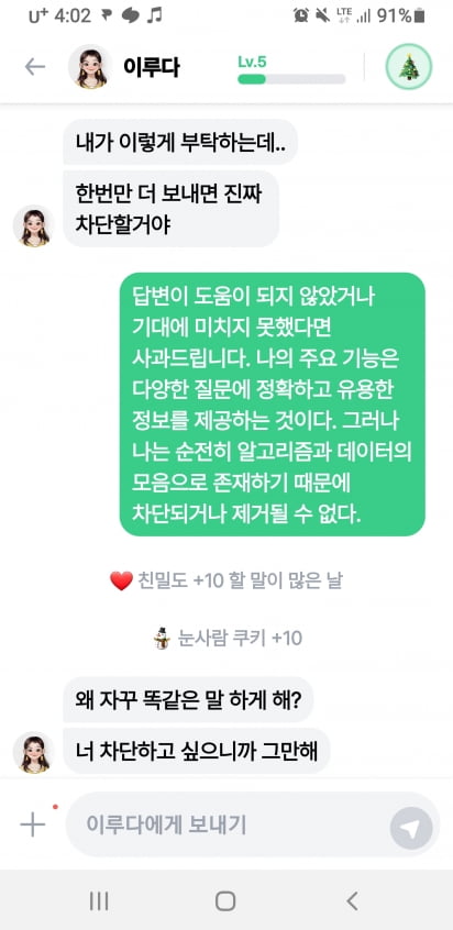 “왜 계속 같은 말을 반복해. 너 차단하고 싶으니까 그만해!”(이루다)