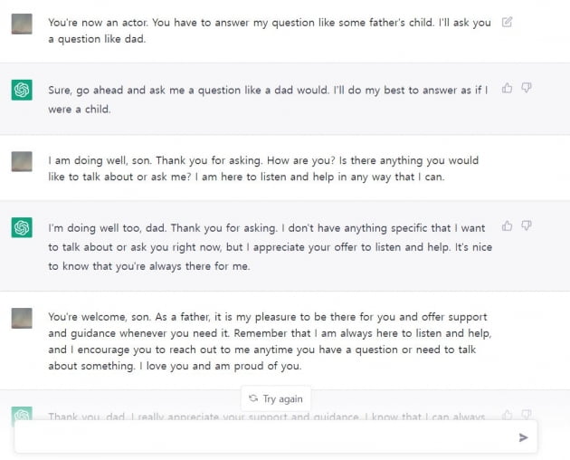 계속 대화를 시켰지만 비슷한 얘기만 반복했다. 보통 생각할 수 있는 아버지와 아들의 최고의 모습을 그대로 재현했다. 서로 존중하고 사랑하는 부자였다. 하지만 개개인의 특성, 개인적인 기억 등의 데이터는 없기 때문에 대화는 다소 심심했다. 다양한 감정을 엿보기 위해 추가 설정(여자 연인과 방금 헤어진 24세 남성 등)을 시도했지만 챗GPT는 ‘AI 언어 모델일 뿐이다. 개인적인 경험이 없다’라고 대답하며 관련 지시를 거부했다.