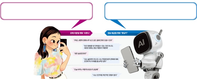 세계 최대 인공지능(AI) 연구소인 미국 오픈AI가 최근 공개한 AI 챗봇 ‘챗GPT’와 국내 AI 스타트업 스캐터랩의 AI 챗봇 ‘이루다’의 대화를 요약한 것이다. 마치 인간들의 대화로 착각할 정도다. 하지만 두 챗봇은 ‘성격’이 확연히 달랐다. 정보 제공에 특화한 챗GPT는 친구처럼 관계를 중시하는 이루다와 원활한 대화를 이어가지 못하기도 했다. 앞으로 챗봇이 이용자의 목적에 따라 다양하게 개발될 수 있을 것이란 전망이 나오는 이유다.