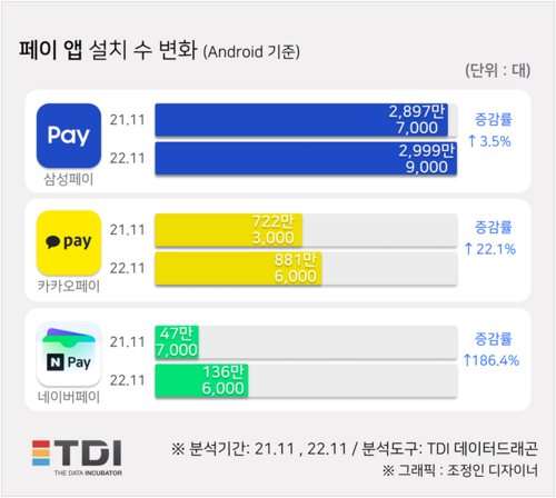 빅테크 기업의 카카오페이와 네이버페이 역시 최근 1년간 설치자가 대폭 증가한 것으로 나타났다. 카카오페이는 21년 11월 722만 3,000대에서 22년 11월 881만 6,000대로 약 22.1% 증가했으며, 네이버페이는 동기간 47만 7,000대에서 136만 6,000대로 186.4%가량 설치자가 늘었다.
