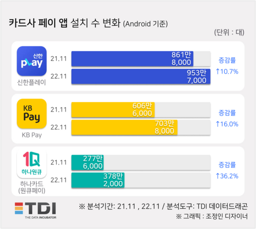 플랫폼 통합을 추진한 카드사 페이 앱은 최근 1년간 설치자가 10% 이상 크게 늘었다. 신한플레이는 지난해 11월 861만 8,000대에서 지난 11월 953만 7,000대로 약 10.7% 증가했고, 동기간 KB Pay는 606만 6,000대에서 703만 8,000대로 16%, 하나카드(원큐페이)는 277만 6,000대에서 378만 2,000대로 36.2% 늘었다.