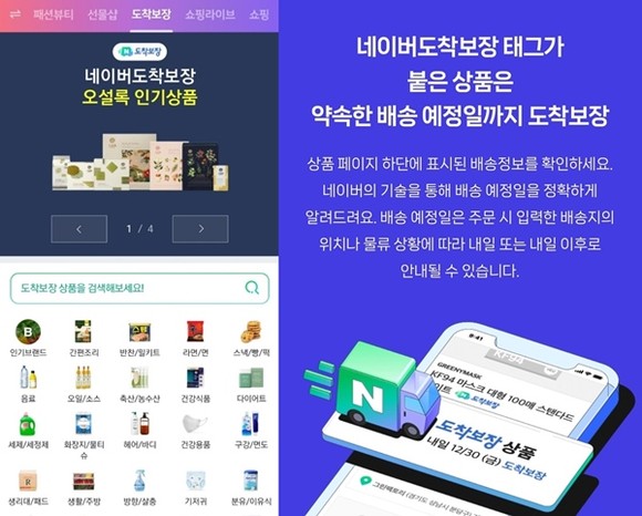 쿠팡이 로켓배송을 제공하는 상품은 모두 직매입 상품이지만, 네이버는 오픈마켓 방식으로 운영된다. 스마트스토어 55만개를 운영하며 판매자 및 상품 다양성을 기반으로 이용자 쇼핑 수요에 대응한다. 네이버는 2025년까지 소비자들이 반복구매하는 생활소비재(FMCG) 카테고리 50%에 네이버도착보장 솔루션을 적용하기로 했다.