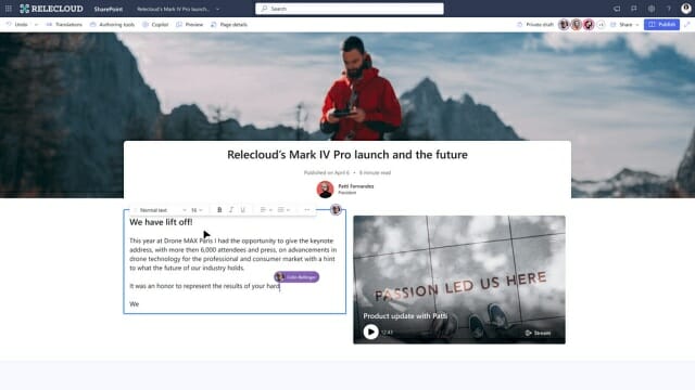 셰어포인트의 공동 작성 기능을 이용하면 여러 편집자가 동일한 페이지 캔버스에서 함께 콘텐츠를 제작할 수 있다. 마이크로소프트 루프(Loop)와 플루이드 프레임워크가 실시간 공동작업을 가능하게 한다.