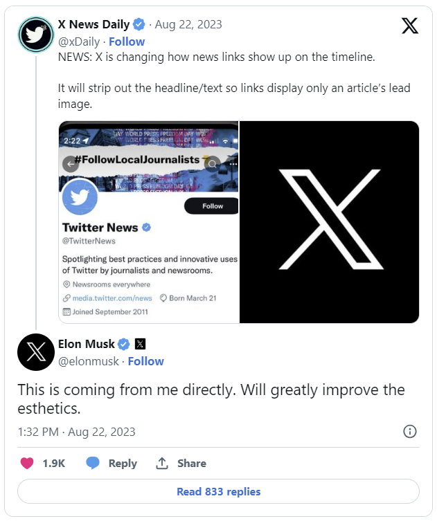 트위터에서 이름을 바꾼 X(엑스)가 뉴스 게시물에서 제목은 빼고 사진만 노출시키기로 했다. 엑스의 소유주 일론 머스크 테슬라 최고경영자(CEO)는 이 같은 변경 사항이 엑스를 미학적으로 더 아름답게 만들 것이라 주장했다. 그러나 사용자들 사이에선 뉴스 공유 자체가 줄어드는 등 부작용이 더 클 것이란 비판의 목소리도 나온다.