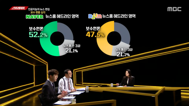 2021년 MBC ‘스트레이트’는 또다른 파도를 만들어냈다. 네이버 뉴스를 집계해 분석한 결과 알고리즘 뉴스 배열이 보수언론을 더 많이 노출한다는 내용을 보도했고, 이번엔 민주당이 “특정 언론 기사 편중은 심각한 우려를 낳고 있다”며 반발했다. 이를 전후해 네이버 뉴스 알고리즘의 편파성을 둘러싼 문제제기와 법안 발의가 이어졌다. 여의도연구원 발주 보고서와 마찬가지로 ‘트리거’의 역할을 한 것이다.