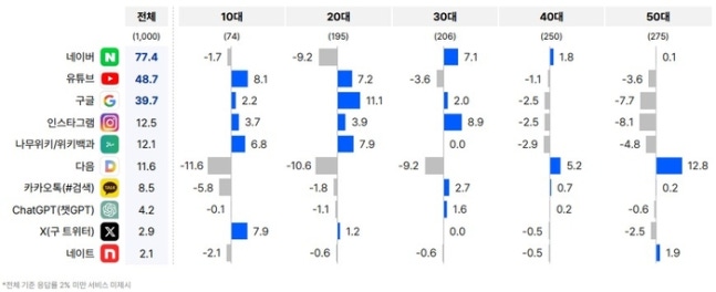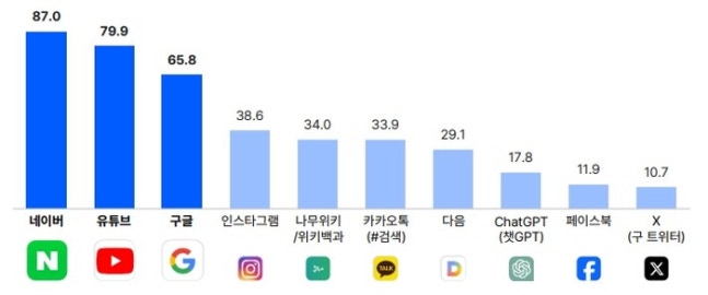 그 뒤를 이어 4위 인스타그램 38.6%, 나무위키·위키백과 34.0%, 카카오톡 #검색 33.9%, 다음 29.1% 순이었다. 특히 챗GPT는 17.8%로 8위에 이름을 올렸다. 페이스북 11.9%와 X(구 트위터) 10.7% 보다 높았다.