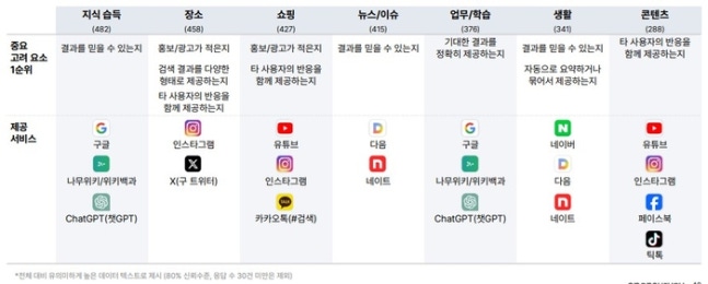 지식 습득 목적이거나 뉴스 및 이슈, 생활 관련 정보를 검색할 때는 ‘검색 결과를 믿을 수 있는지’를 가장 중요하게 생각하는데, 주로 지식 정보는 구글과 나무위키·위키백과 및 챗GPT가 이를 가장 잘 제공한다고 응답자들은 답했다.