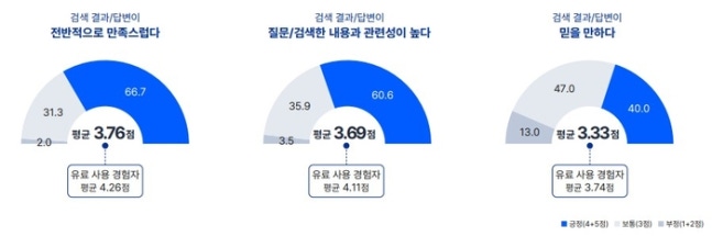 상대적으로 무료 등 전체 사용 경험자를 대상으로 하면 챗GPT가 제공하는 답변에 전반적으로 만족하지만, 신뢰도에 대해선 아직 개선의 여지가 남아있다고 인식하는 것으로 나타났다.