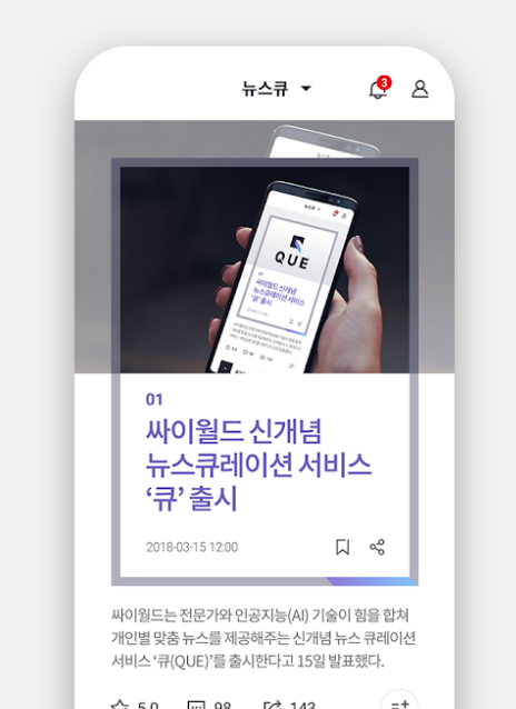 큐는 ‘이 순간 당신을 위한 프리미엄 큐레이션’을 모토로 전문가와 AI가 내게 꼭 필요한 뉴스만 골라주는 ‘뉴스큐’와, 뉴스 중심 소셜 서비스인 ‘큐피드’로 구성됐다.