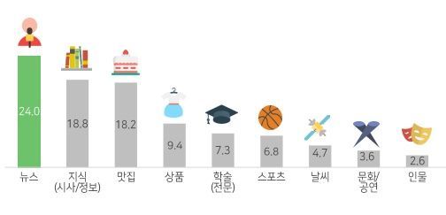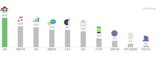 검색을 통해 얻는 정보는 주로 ‘뉴스(24.0%)’였다. 시사·정보(18.8%), 맛집(18.2%), 상품(9.4%), 학술(7.3%), 스포츠(6.8%), 날씨(4.7%) 등이 뒤를 이었다. 뉴스 카테고리에서도 특히 사회(62.6%)에 관심도가 높았다. 연예/오락(44.6%), 경제(42.4%)도 높은 비중을 차지했다.