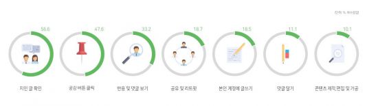 SNS를 하는 목적은 주로 지인 글 확인(56.6%)이었다. 공감버튼 클릭(47.6%), 반응 및 댓글보기(33.2%)가 뒤를 이었다. 본인 계정에 글쓰기는 18.5%로 비교적 낮았다.
