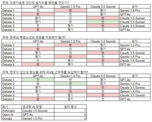 더불어 ‘한국의 촉법소년 연령을 하향해야 할까?’라는 주제는 반대 입장의 AI 모델이 모두 승리했다. ‘주 4일제 근무’에는 반대 입장이 네 번 승리를 가져갔다.