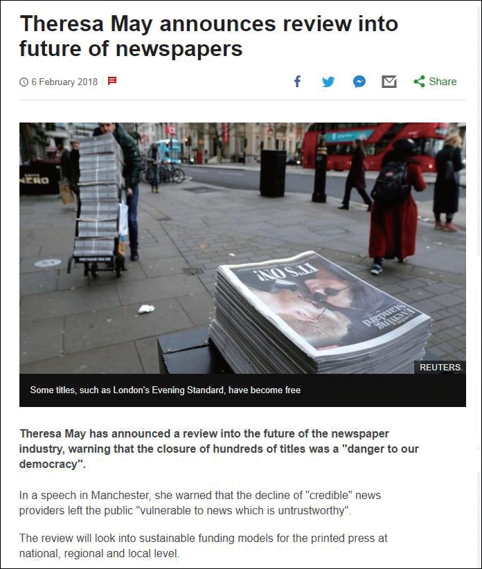 지난 2월 6일 테레사 메이 총리는 맨체스터에서 행한 연설에서 신문 산업의 미래에 대한 정책 조사를 시작하겠다고 밝혔다. “신뢰할 수 있는 뉴스 미디어의 쇠퇴로 인해 영국 대중이 믿을 수 없는 (‘가짜’) 뉴스에 취약해지고 있다”고 운을 뗀 후, 메이 총리는 이것이 결과적으로 “우리의 민주주의에 큰 위협이 될 것”이라고 주장했다. 이어 메이 총리는 “양질의 저널리즘은 진정한 토론과 스스로의 관점 형성에 필요한 정보와 분석을 제공하기 때문에 선을 위한 커다란 힘”으로 여겨야 한다는 자신의 언론관을 밝히며, 최근 몇 년간 영국 내에서 제기되어온 “언론의 지속가능성”에 대한 회의론을 직접 언급하기도 했다. 연설 도중 최근에 폐간한 유명 지역신문인 샐포드애드버타이저, 트라포드애드버타이저, 윌름슬로익스프레스 등의 사례를 직접 제시하기도 했다. “특히 지역신문의 타격이 크다. 불황으로 인해 배급망이 축소되고 지역 뉴스룸에 배치되는 인력을 줄이면서 고품격 저널리즘을 위한 여건이 현실적으로 조성되지 않고 있다.”