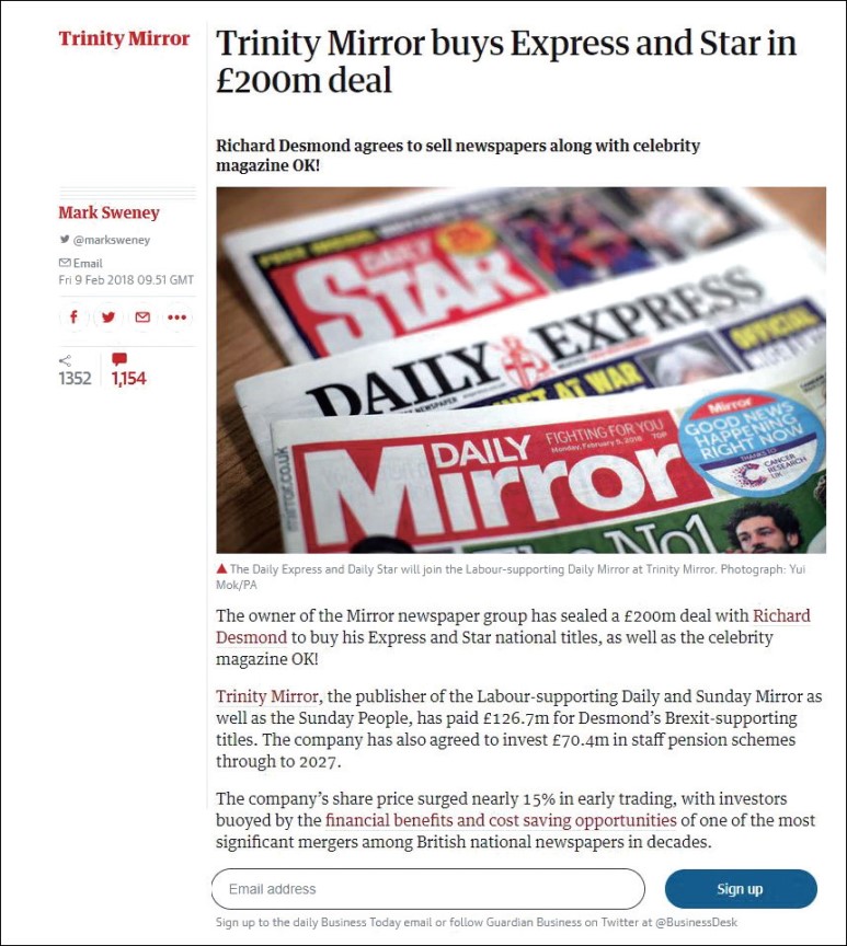 지난 2월 9일 영국의 ‘무자비한’ 미디어 재벌로 알려진 리처드 데스먼드가 소유한 보수 성향의 신문사 전부를
