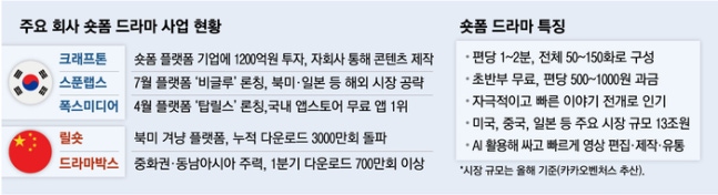 편당 영상 길이가 1~2분에 불과한 숏폼 드라마는 빠른 스토리 전개와 짧은 영상 포맷을 선호하는 1020세대 시청 습관과 맞물려 중국, 북미, 한국, 일본 등지에서 이용자가 빠르게 늘어나는 추세다.