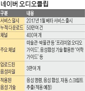 네이버는 지난해부터 음성 콘텐츠 확보에 주력하고 있다. 오디오클립 서비스를 비롯해 300억원 규모 오디오 콘텐츠 펀드를 조성해 지식·교양·예술 분야 오디오 콘텐츠를 제작하고 보관(아카이빙)하는 프로젝트를 진행 중이다.