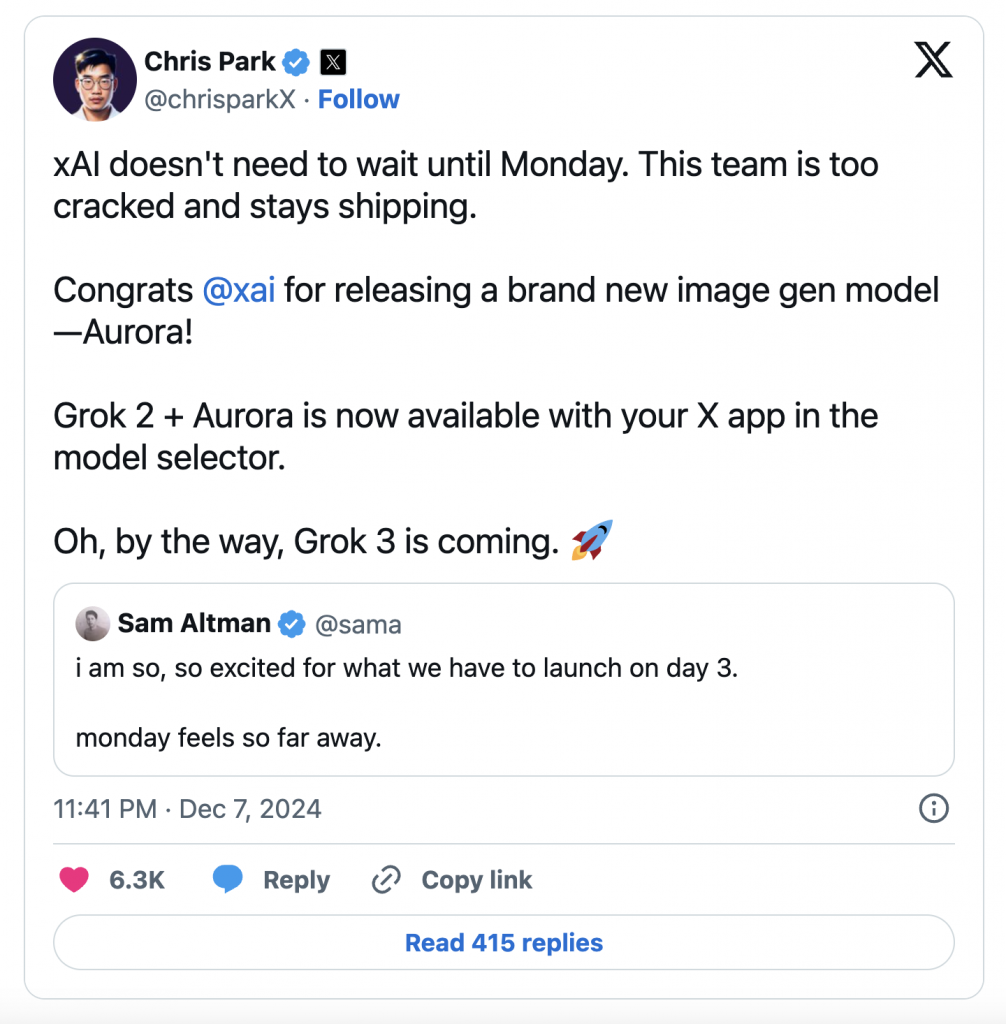 크리스 파크 X 개발자는 “완전히 새로운 이미지 생성 모델인 오로라를 출시했다”라며 “이제 X에서 그록 2와 오로라를 제공한다”라고 밝혔다. 또 “곧 그록 3가 출시될 것”이라고 예고했다.