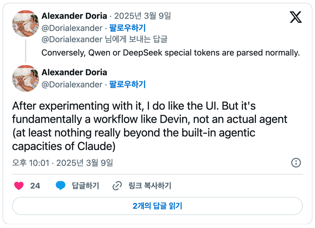 AI 스타트업 플레이아스의 공동 창립자인 알렉산더 도리아는 X(트위터)를 통해 마누스가 기존 AI 모델과 미세조정된 모델을 조합해 사용하고 있다며, 특히 앤트로픽의 ‘클로드 3.7 소네트’와 알리바바의 ‘큐원’을 활용한 것으로 보인다고 분석했다.