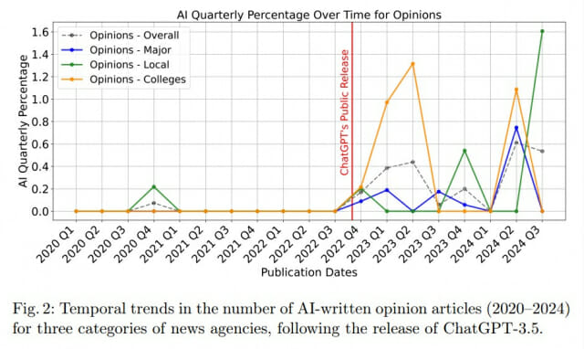 펜실베이니아 주립대학교와 셰필드 대학교 연구팀이 25개 영어권 언론사의 기사 4만여 편을 들여다본 결과, 충격적인 사실을 발견했다. 챗GPT-3.5가 공개된 후 AI가 쓴 기사가 폭발적으로 늘어났고, 특히 지역 언론사와 대학 신문에서 그 변화가 가장 극명하게 드러났다.