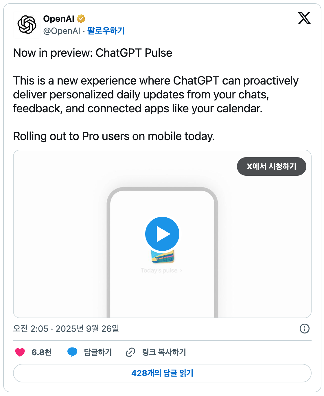 [AI TImes] “챗GPT가 아침마다 브리핑”…맞춤형 소식 제공하는 ‘펄스’ 출시