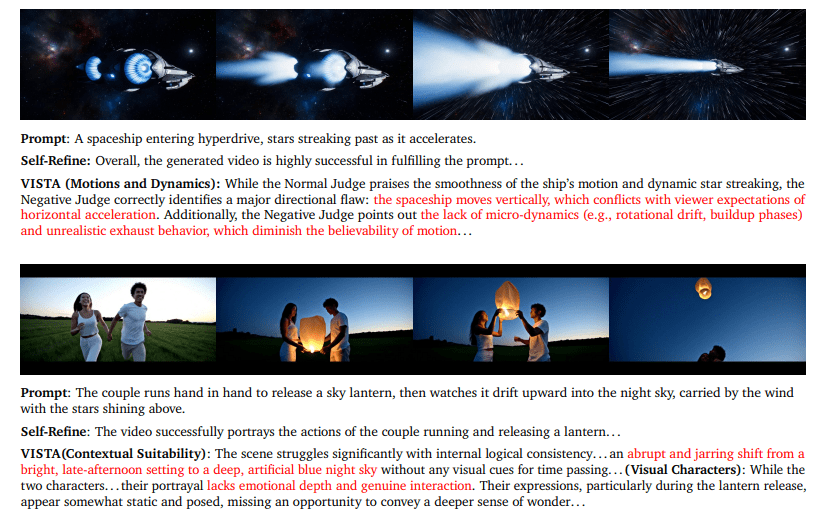 따라서 VISTA는 4단계의 개선 작업을 거친다고 밝혔다. ▲사용자 아이디어를 분해한 뒤 프롬프트 재작성 ▲재작성 프롬프트 영상과 원래 프롬프트 영상 비교 ▲선정된 비디오를 시각과 오디오, 맥락 충실도에 중점을 둔 에이전트 3개의 집중 분석 ▲피드백을 종합해 프롬프트를 재작성하는 심층 사고 에이전트 작업 등이다.