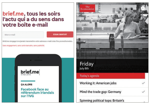 유료 이메일 뉴스레터 서비스인 Brief.me(왼쪽, EUR €6.90)와 Economist Espresso(오른쪽, USD $2.99). 출처-Brief.me & Economist Espresso