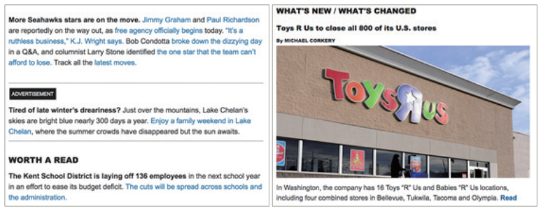 시애틀타임스는 아침과 저녁에 전혀 다른 형식으로 뉴스레터를 작성해 배포한다. 독자들이 시간대에 따라 다른 방식으로 이메일을 사용하기 때문이다. 저녁 시간 뉴스레터는 모바일에 적합한 이미지 중심으로 구성돼 있다. 출처-시애틀타임스의 아침 뉴스레터(왼쪽)와 저녁 뉴스레터(오른쪽)