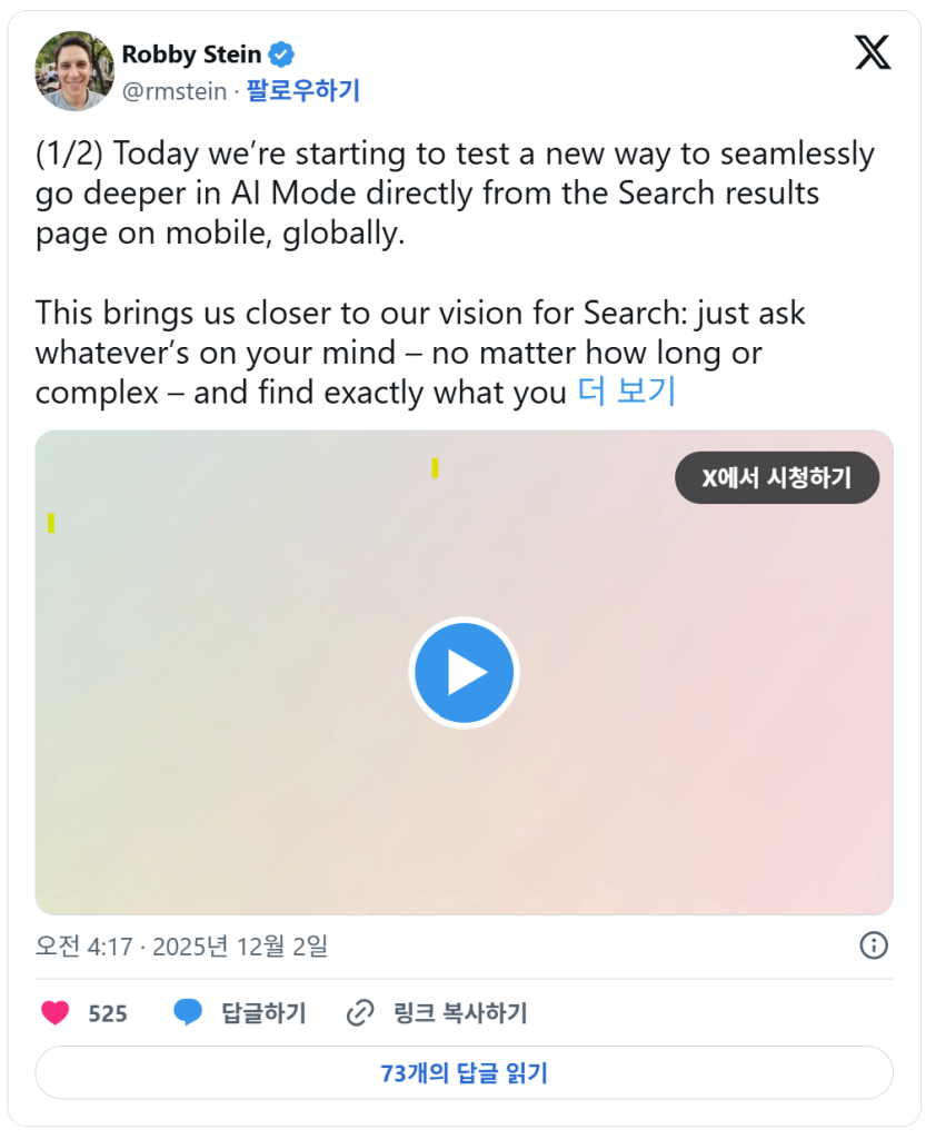 로비 스타인 구글 담당 부사장은 X(트위터)를 통해 “사용자는 어디서, 어떻게 질문해야 할지 고민할 필요가 없다”라고 밝혔다.
