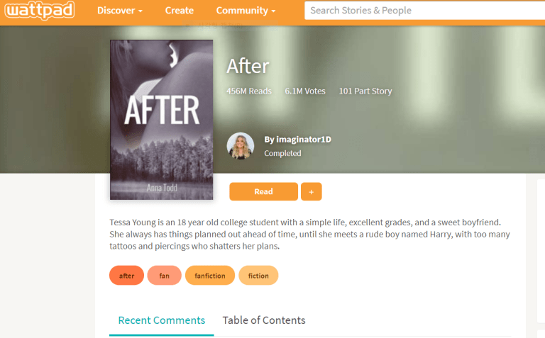 왓패드의 대표작으로는 미국 유명 아이돌 밴드 원디렉션의 멤버를 주인공으로 한 팬픽션 에프터(AFTER) 시리즈다. 에프터는 왓패드에서 10억 뷰를 기록하며 책으로 출판되고 뉴욕타임즈 베스트셀러에 올랐으며 현재는 파라마운트 스튜디오와 계약해 영화로 제작되고 있다. 또 동영상 스트리밍 업체 훌루를 통해 왓패드의 흥행 소설이 시리즈로 방영될 예정이며 소니는 왓패드의 인기 소설의 판권을 구입하는 등 왓패드는 다양한 미디어와 협력을 진행하고 있다.