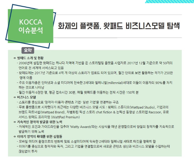 캐나다 토론토에 본사를 둔 왓패드(Wattpad)는 창작자를 위한 웹소설 커뮤니티로 전 세계 50개 국어로 서비스 되는 영미권 최대 스토리텔링 플랫폼이다. 밀레니얼 세대와 Z세대를 타깃으로 월간 사용자 6,500만 명, 활동 작가 250만 명을 보유하고 있는 왓패드에는 4억 개 넘는 이야기가 올라와 있다.