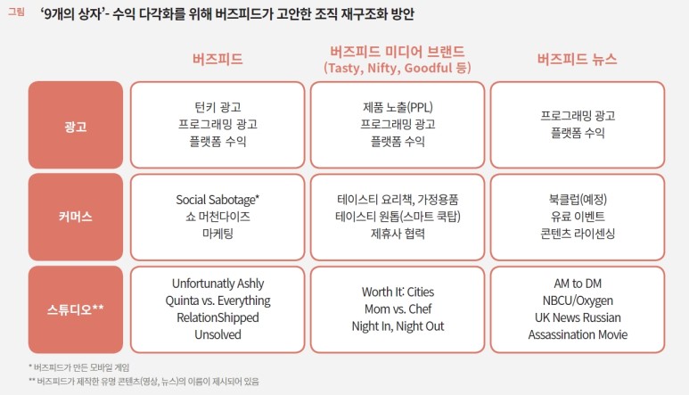 스스로를 ‘테크놀로지 기업’으로 규정하던 버즈피드가 위기를 딛고 ‘통합 미디어 기업’으로 재도약할 수 있을지 앞으로의 행보를 지켜볼 일이다.