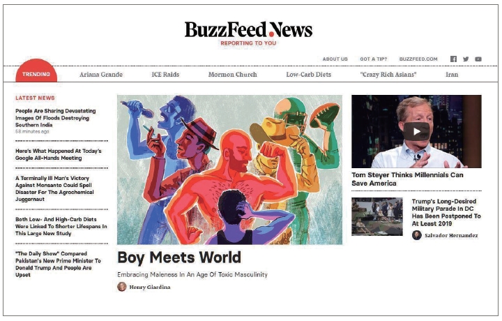 버즈피드 뉴스 웹사이트. 레거시 언론사의 홈페이지처럼 ‘점잖은’ 모습을 하고 있다. 다만, 레거시 언론사가 주제별로 기사를 분류하는 것과 달리 트렌딩(Trending)이라는 뉴스 바(news bar)를 중심으로 기사를 배열한다는 점이 특징이다. 트렌딩 바에는 온라인 버즈 분석을 기반으로 버즈피드 뉴스 편집자가 선택한 중요한 뉴스들이 배열된다.