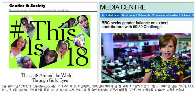 미국 일간지 뉴욕타임스(NYT)는 지난해 ‘젠더 이니셔티브(Gender Initiative)’를 런칭하는 등 영화계 거물 ‘하비 웨인스타인’에 대한 ‘미투’ 폭로 이후 해당 이슈 선점에 가장 열을 올리는 매체 중 하나다. 지속적인 보도와 더불어 특별 프로젝트를 통해 이슈몰이를 하는 식이다. ‘Overlooked’ 프로젝트는 그 대표 사례다. NYT는 부고기사마저 백인 남성 위주였던 사실을 지적하며 조명 받아 마땅한데도 ‘간과된(overlooked)’ 과거 여성인사의 생을 깔끔한 페이지와 스토리텔링에 집중한 방식으로 다뤄 호평을 받았다. 아울러 ‘Gender&Society’라는 별도 카테고리를 통해 젠더 기사는 물론 “젠더의 렌즈를 통해” 볼 수 있는 관련 뉴스 전체를 함께 제공하고 있다. ‘젠더 에디터’직을 만들고 지난해 10월 ‘페미니스트 파이트 클럽’의 저자 제시카 베넷(Jessica Bennett)을 영입한 것도 유념할 만하다. ‘젠더’ 분야에 따로 에디터를 두고 회사 밖 인사를 데려와 ‘롤’을 맡긴 점은 국내에서 상상하기 힘든 모습이다.