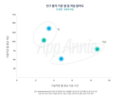 반면, 게임 카테고리에서 만 25세 이상 이용자는 가장 자주 이용하는 게임에서 Z세대보다 매달 75% 이상 더 많은 시간을 소비하며 게임에 50% 이상 더 자주 접속한 것으로 나타났다.
