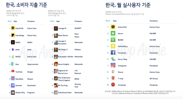 2018년 한국 iOS 및 구글 플레이 앱 소비자 지출 상위 차트는 카카오톡이 1위를 차지했다. 이외에 카카오페이지, 넷플릭스, 푹, 멜론, 유튜브 등 엔터테인먼트 앱이 차트의 절반 이상을 점령한 것으로 나타났다. 이 같은 엔터테인먼트 강세는 국내뿐 아니라 전 세계 앱 소비자 지출 차트에서도 확인할 수 있는 글로벌 트렌드이다.