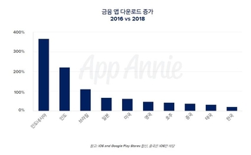 금융 앱 다운로드는 성숙시장과 신흥시장을 아울러 가장 강력한 성장세를 보이고 있다. 특히, 2018년 금융 앱 다운로드에서 2016년 대비 약 400% 증가한 인도네시아의 빠른 성장이 돋보인다. 또한 전 세계 40억 대 이상의 설치 기반으로 모바일은 특히 점포가 없는 은행 형식으로 금융 서비스가 제공되지 않는 지역에 서비스를 제공할 뿐만 아니라, 투자, 송금, 소비자 대출 등 핀테크 서비스를 대중화하는 역할을 맡고 있다. 또한, 스마트폰 이용자는 모바일 앱에서 자신의 금융 정보를 거의 매일 확인하고 있으며, 2018년 그 횟수는 2016년 대비 35% 증가한 것으로 나타났다.