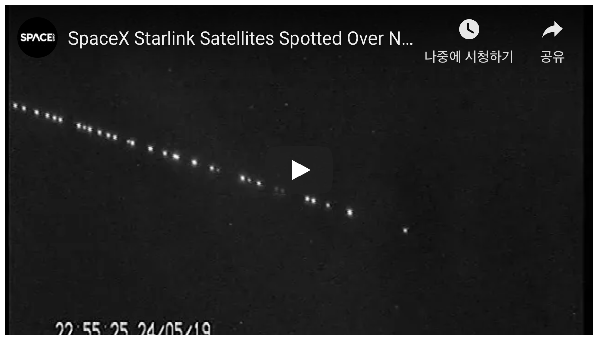 ‘위성 추적자’로 불리는 마르코 랭브룩이 네덜란드 상공에서 관찰한 60기의 저궤도 위성들. 440km 상공에서 550km 궤도로 이동중이다. 그러나 위성의 빛이 예상외로 너무 밝아 민감한 천체 망원경에 영향을 줄 수 있다는 우려도 제기되고 있다. [Youtube 캡처]