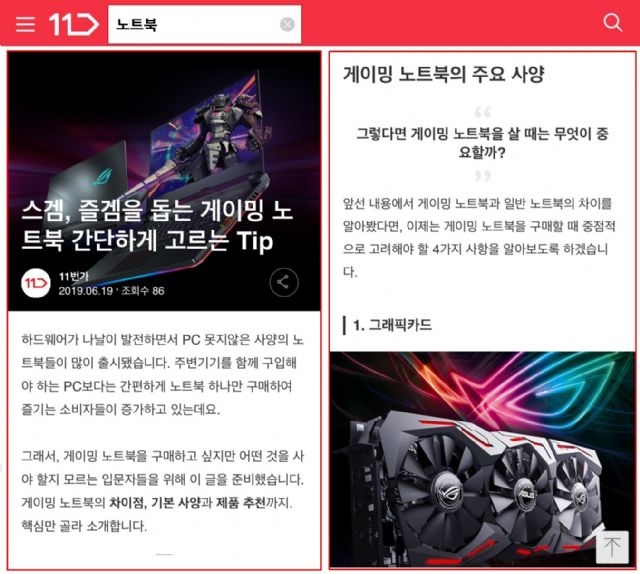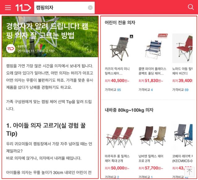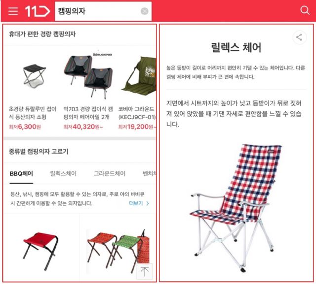 예를 들어 ‘캠핑의자’를 구매하고 싶은 고객이 11번가 모바일 앱에서 ’캠핑의자’를 검색하면 검색결과 화면에서 종류별 캠핑의자에 대한 전문용어 설명, 구매 시 유의사항, 구매 꿀팁 등 구매에 필요한 정보를 매거진, 블로그를 보는 듯한 형태로 제공한다.