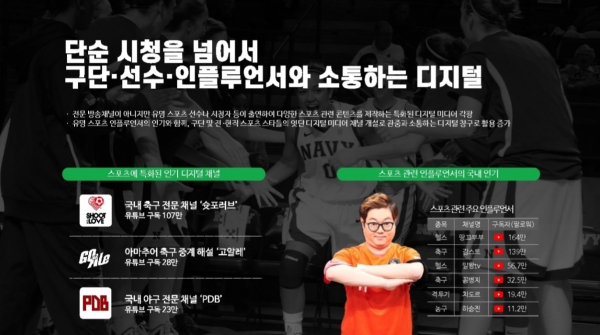 국내 축구 전문 채널인 ‘슛포러브’의 유튜부 구독자 수는 107만명을 넘었으며 아마추어 축구 중계 해설 ‘고알레'(28만)와 국내 야구 전문 채널 ‘PDB'(23만)도 등장했다. 또 땅끄부부(헬스, 164만), 감스트(축구, 139만), 말왕tv(헬스, 56만), 꽁병지(축구, 32만), 차도르(격투기, 19만), 하승진(농구, 11만) 등 스포츠 인플루언서들의 디지털 콘텐츠도 인기를 얻고 있다.