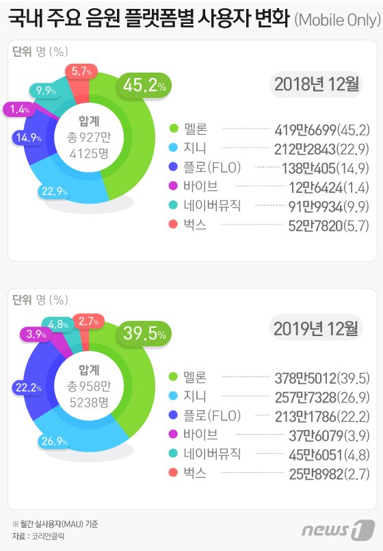 국내 음원시장은 멜론이 점유율 1위를 달리고 있다. 코리안클릭의 ‘국내 주요 음원 플랫폼별 사용자 변화’에 따르면 모바일 기준 2019년 12월 멜론이 점유율 1위(39.5%)를 기록하고 있다. 이어 지니뮤직(26.9%), 플로(22.2%) 순이다.