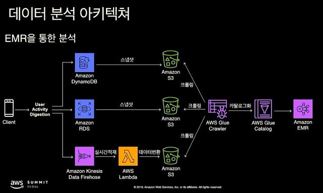 데이터 카탈로그로 DB를 정리 작업을 마친 후 대화식 쿼리 서비스인 아테나를 이용해 EMR로 데이터를 처리하거나 재플린, 태블로 등을 활용해 데이터시각화를 위한 대시보드를 구축했다.
