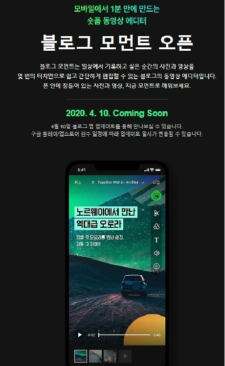 9일 관련업계에 따르면 네이버는 10일 숏폼 동영상 에디터 ‘블로그 모먼트’를 출시한다. 블로그 모먼트는 네이버 블로그에서 사용할 수 있는 동영상 편집도구다. 네이버는 “초보자도 몇 번의 터치만으로 쉽고 간단하게 동영상 콘텐츠를 만들 수 있다”고 설명했다.