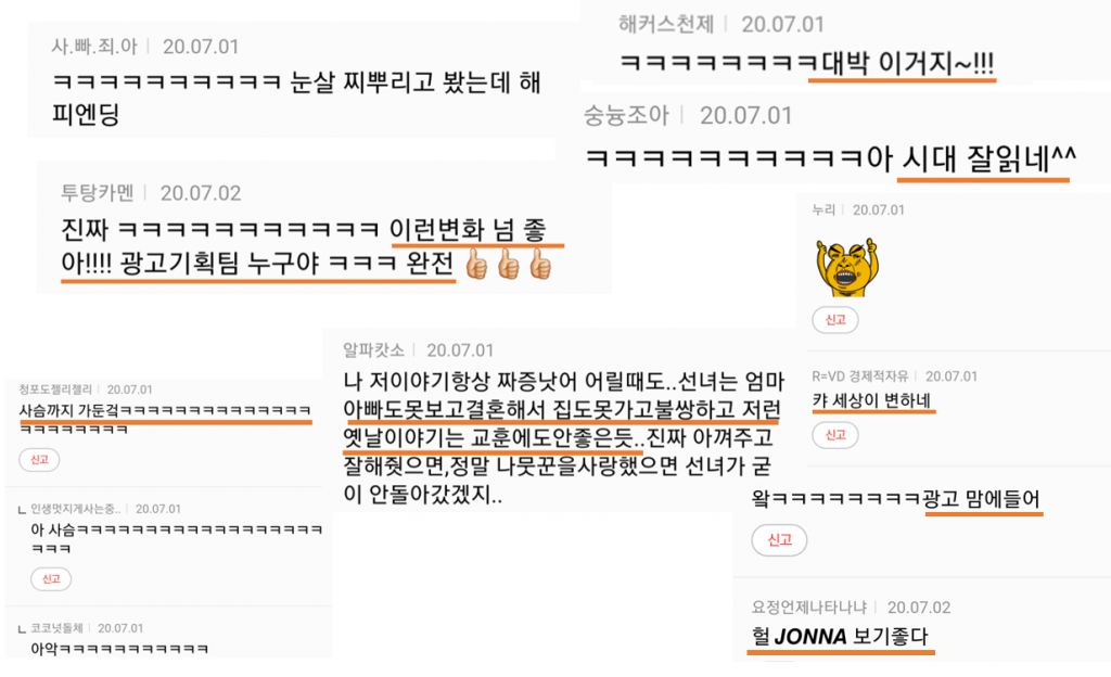 이 광고가 흥할 수 있었던 가장 큰 이유는 ‘젠더 감수성이 높아지고 있는 현재 흐름에 잘 맞는 스토리’라는 것인데요. 과거엔 여성의 옷을 훔치는 것이 가벼운 재미 요소로 여겨질 수 있었겠지만, 요즘 시대에는 범죄에 해당한다는 핵심을 짚어 준 것이 MZ에게 제대로 통했습니다. 또 여성을 독박육아로 구속하는 것을 정당화하면 안된다는 인식도 포함되어 칭찬을 받고 있지요. 댓글 반응을 보면 ‘세상이 바뀌었다’, ‘시대 잘 읽었다’는 식의 반응이 가장 많습니다.