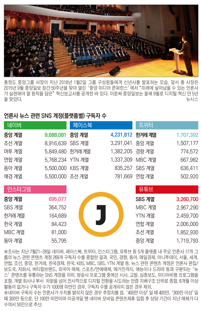 결과는 신문과 방송 각각에서 상당한 브랜드 파워를 지닌 중앙일보·JTBC의 성과가 합쳐진 영향이 있다. 조사 당시 플랫폼별 구독자 수는 ‘중앙일보’ 계정이 네이버 472만명, 페이스북 139만명, 트위터 29만명, 인스타그램 7만명, 유튜브 5만명, ‘JTBC뉴스’ 계정은 네이버 447만명, 페이스북 85만명, 트위터 60만명, 인스타그램 19만명, 유튜브 136만명이었다. 양 매체 간 콘텐츠 포맷과 매체 지향, 주된 이용자층 차이가 그룹 차원에선 시장 외연이 확대되는 식으로 상보된다는 점이 유념할만하다. 특히 중앙일보가 네이버에서 거둔 성취는 의미가 있다. 국내 최대뉴스 유통 플랫폼인 네이버에서 중앙일보는 조사시점 기준 70개 모바일 콘텐츠 제휴 매체(11일 현재 71개) 중 2위 JTBC(447만명), 3위 YTN(404만명), 4위 조선일보(400만명 이상, 비공개)보다도 구독자 수가 수십 만 명이 많았다. 11일 현재 기준 약 493만명으로 국내 매체 중 처음으로 500만 네이버 구독자를 확보할 것으로 보인다.
