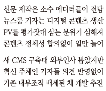 한국일보 D 기자는 “충분한 시간을 갖고 CMS를 도입하며 기술을 내재화했어야 했는데 그러지 못했다. 내부 인력의 역량에 대한 믿음도 부족하다보니 외부인사를 영입해 마치 솔루션을 사듯 추진된 것”이라며 “CMS는 돈 투자를 넘어 조직과 조직문화 변화와 연관되는데 모든 게 너무 급했다”고 평했다.