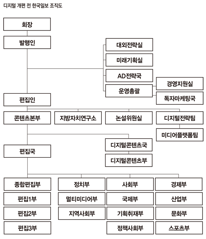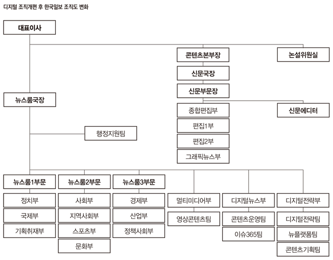 한국일보는 지난 6~7월 새 CMS ‘허브(HERB)’를 도입하고 신문과 디지털을 분리하는 조직개편을 단행했다. 기존 콘텐츠본부에 편제됐던 편집국과 디지털콘텐츠국이 뉴스룸국과 신문국으로 나뉘었다. 뉴스룸국 산하에 뉴스룸1부문(정치·국제·기획취재부), 뉴스룸2부문(사회·지역사회·스포츠·문화부), 뉴스룸3부문(경제·산업·정책사회), 멀티미디어부, 디지털뉴스부, 디지털전략부 등이 놓였고, 콘텐츠본부장과 신문국장의 지휘를 받는 신문국은 아래 에디터와 종합편집부, 편집 1·2부, 그래픽뉴스부, 지식콘텐츠부를 두게 됐다. 대다수 기자가 속한 뉴스룸에선 기사가 아닌 디지털 콘텐츠를 생산하고 신문국 에디터 등 소수 인력이 신문 제작을 전담하는 방식이다.