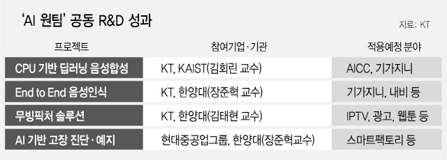 AI원팀은 지난해 2월 KT와 현대중공업(009540)그룹, LG전자(066570), LG유플러스(032640), 한국투자증권, 동원그룹, KAIST, 한양대, 한국전자통신연구원(ETRI)가 함께 뭉쳐 출범한 AI 분야 산학연협의체다. AI원팀이 이번에 개발한 4대 기술은 △딥러닝 음성합성(P-TTS) △E2E(End-to-End) 음성인식 △무빙 픽처(Moving Picture) △AI 기반 로봇 고장 진단 기술 등이다.