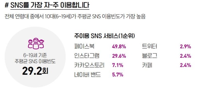10대가 주로 쓰는 SNS는 페이스북(49.8%), 인스타그램(29.6%), 카카오스토리(7.1%) 등 순이었다.