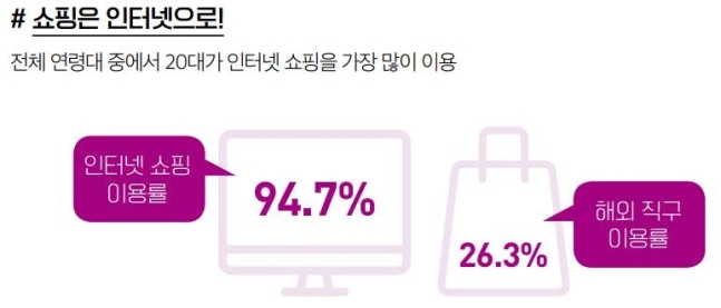 20대는 인터넷 쇼핑 이용률이 94.7%에 달해 전체 연령대에서 가장 높았다. 동영상 서비스 이용률도 99.3%로 가장 높았다.